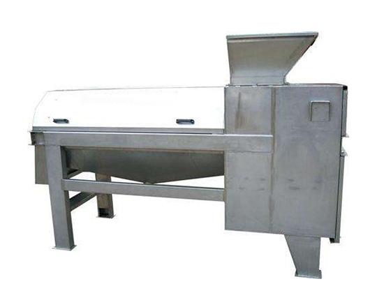 電機通過三角帶傳動,使轉子部件高速旋轉,水果由進料口進入機內,送料漿葉將物料螺旋輸送至去核棒,在去核棒的作用下,物料被搗爛。由于離心力的作用,物料中的汁液和肉質(已成漿狀)通過篩網上的篩孔進入下道工序,核則由出渣漿葉排出出渣口,從而實現漿渣自動分離。當果肉進入二道筒體內時,擋漿盤將物料均勻排發到刮板和篩網之間,由于刮板的回轉作用和導程角的存在,使物料沿著園筒向出口端移動,移動的軌跡呈螺旋狀,物料就在刮板和篩網之間移動過程中受離心力的作用而被擦碎,汁液和肉質(已成漿狀)從篩孔通過進入下道工序,皮和籽等則從出渣斗排出,從而達到自動分離的目的。