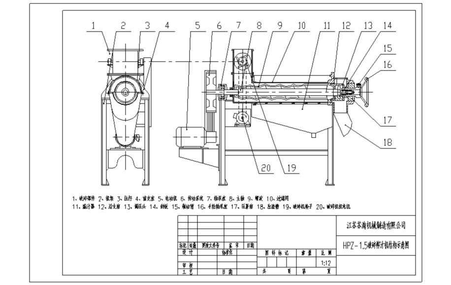 簡介—由前支座、進料斗、螺旋、過濾網、盛汁器、后支座、出渣槽等零件組成,螺旋主軸左端支承于滾動軸承座內,右端支承于手輪軸承座中,電動機通過一對三角皮帶輪驅動螺旋進行工作。